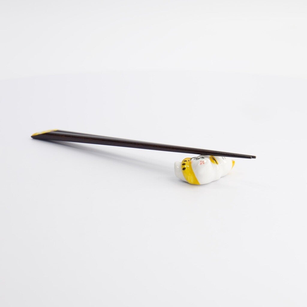 Een set met eetstokjes van hout en een eetstokjeslegger van keramiek in de vorm van een kat.